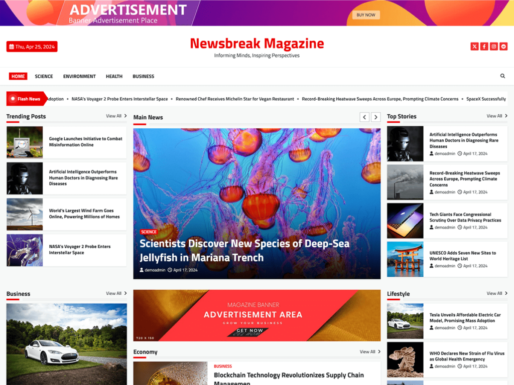 Jarida mimics premium news themes with its grid layout, trending posts section, and ad management.